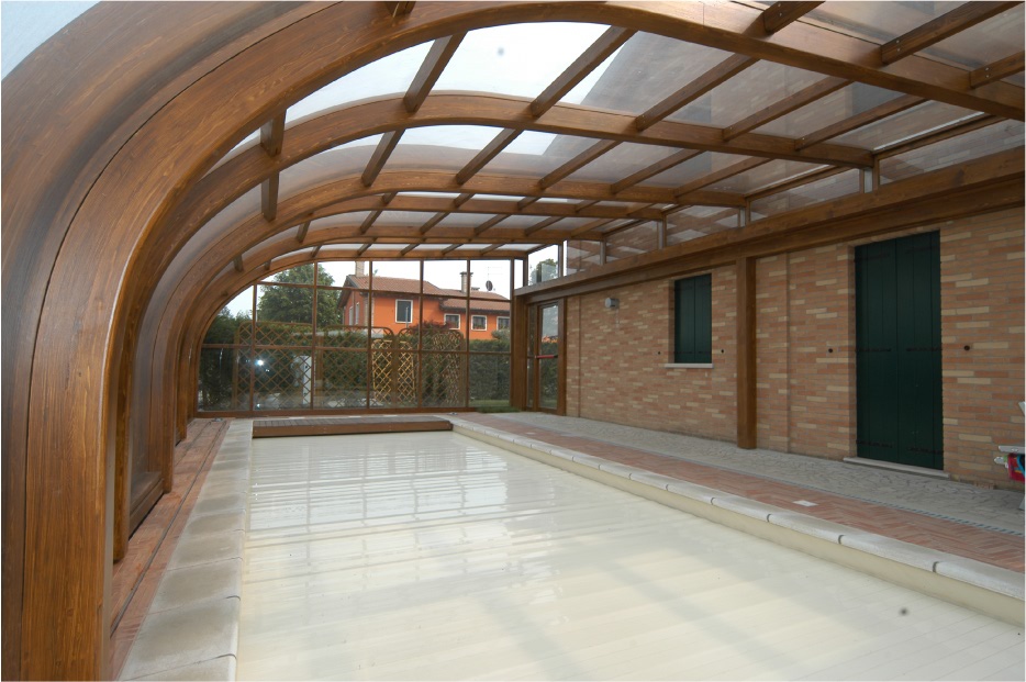 Piscina Com. Montecorvino Pugliano (SA)Copertura telescopica standard (23x36m), manuale con strutture in legno lamellare e alluminio.Serramento di testata smontabile.