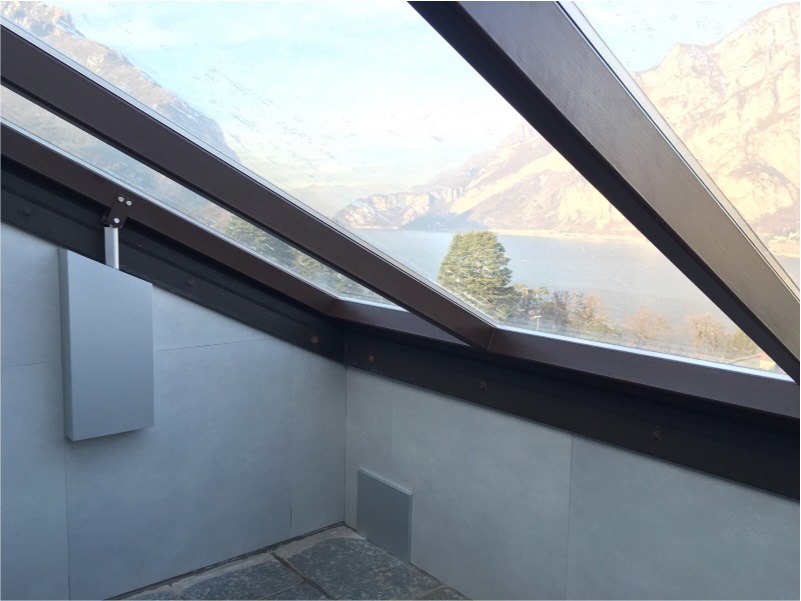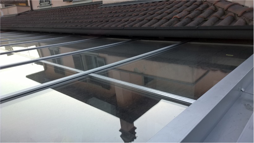 Tetto mobile per terrazzoCopertura apribile automatica per terrazzi con tetto in vetrocamera basso emissivo antisfondamento. Strutture in alluminio estruso a taglio termico.