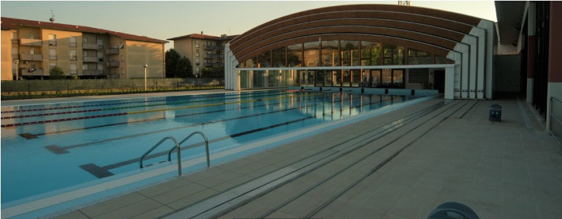 Piscina Comunale Treviglio(BG)Copertura telescopica standard (23x41m), automatica ad alto isolamento termico con strutture in legno lamellare e alluminio.Serramento di testata a saliscendi.