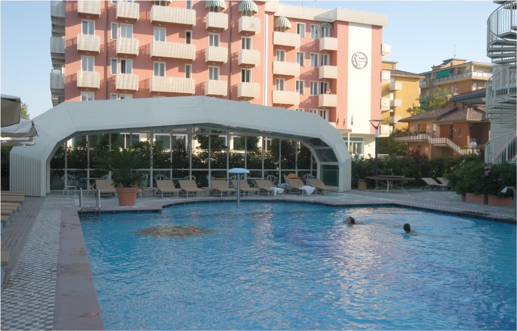 Palace hotel Cervia(RA)Copertura telescopica standard manuale adatta alle mezze stagioni, con apertura su un lato.Tetto in policarbonato alveoalre, serramenti in vetro stratificato. Strutture in alluminio estruso.